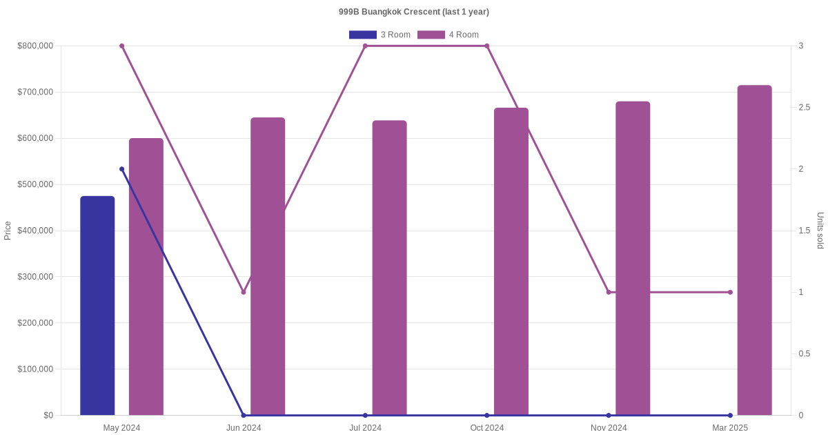 Below is a quick summary of the resale transactions volume and average price trends for the 3 room and 4 room units at 999B Buangkok Crescent.