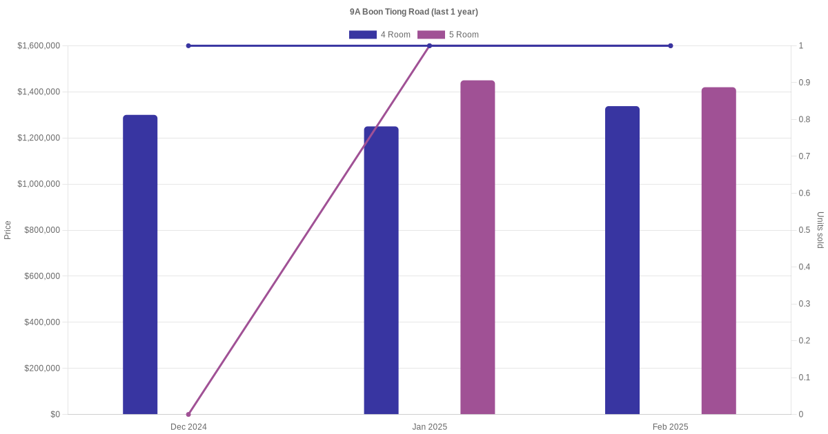 Below is a quick summary of the resale transactions volume and average price trends for the 4 room and 5 room units at 9A Boon Tiong Road.