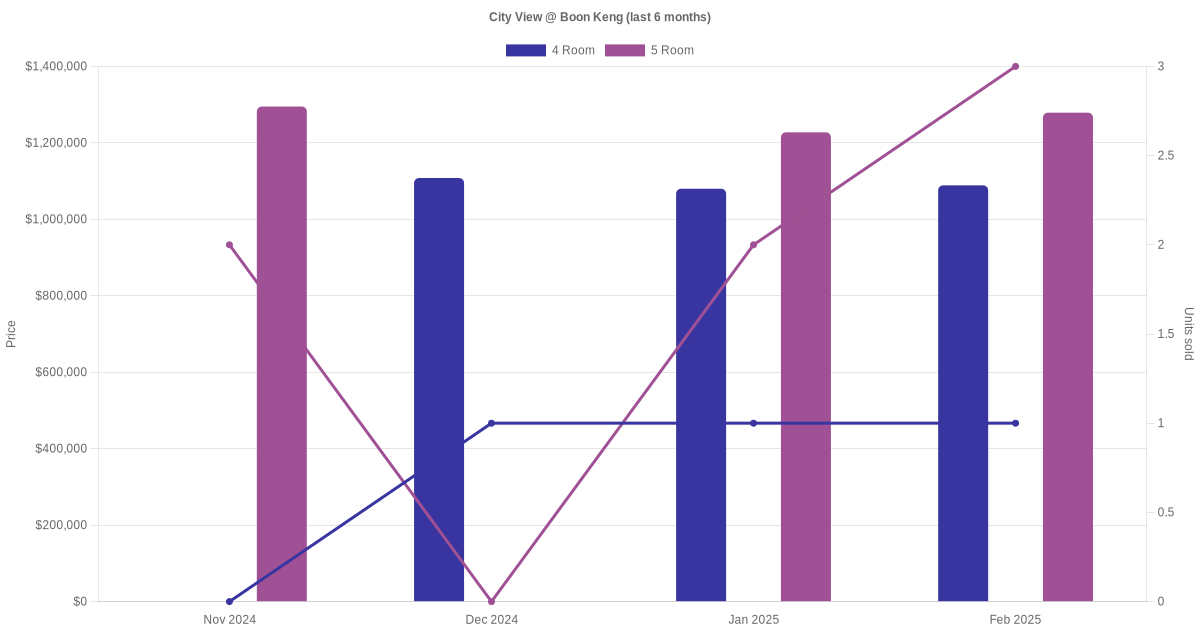 There were a total of 75 resale transactions in the last 3 years for HDB flats at City View @ Boon Keng. The latest recorded transaction was in Jan 2026.
