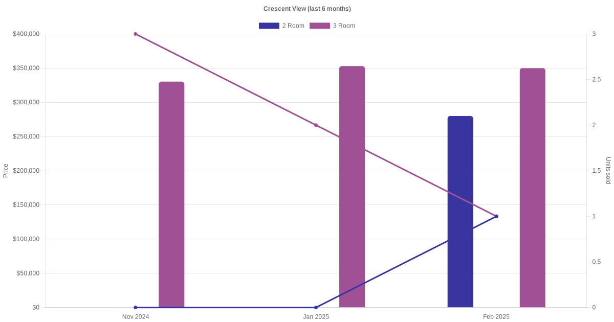 There were a total of 44 resale transactions in the last 3 years for HDB flats at Crescent View. The latest recorded transaction was in Dec 2025.