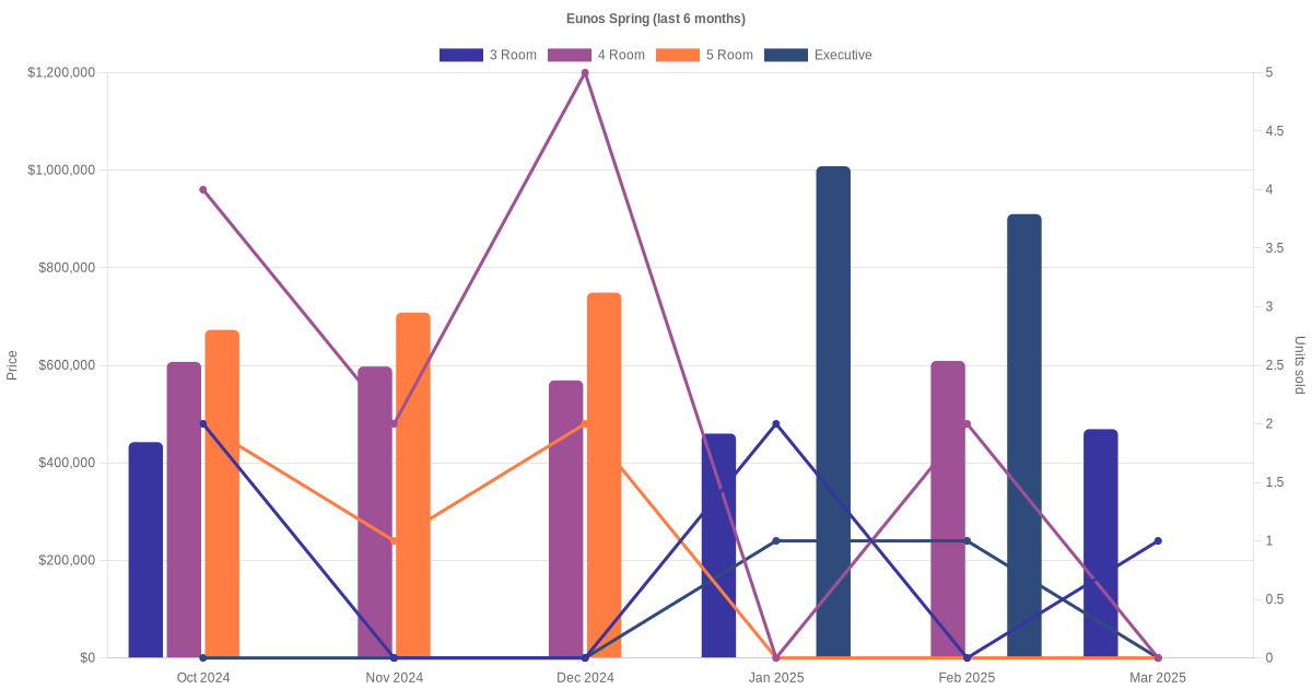 There were a total of 170 resale transactions in the last 3 years for HDB flats at Eunos Spring. The latest recorded transaction was in Dec 2025.