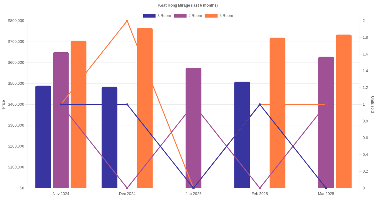 There were a total of 121 resale transactions in the last 3 years for HDB flats at Keat Hong Mirage. The latest recorded transaction was in Jan 2026.