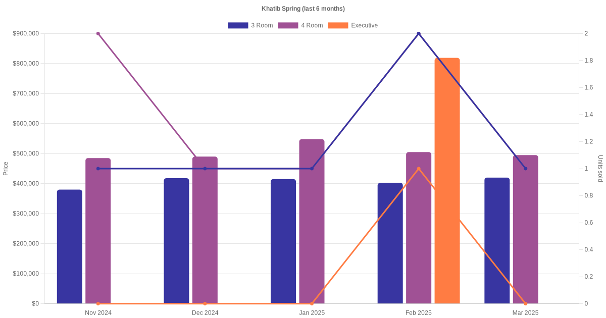 There were a total of 95 resale transactions in the last 3 years for HDB flats at Khatib Spring. The latest recorded transaction was in Jan 2026.