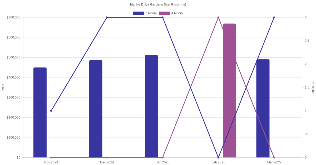 There were a total of 84 resale transactions in the last 3 years for HDB flats at Marine Drive Gardens. The latest recorded transaction was in Jan 2026.
