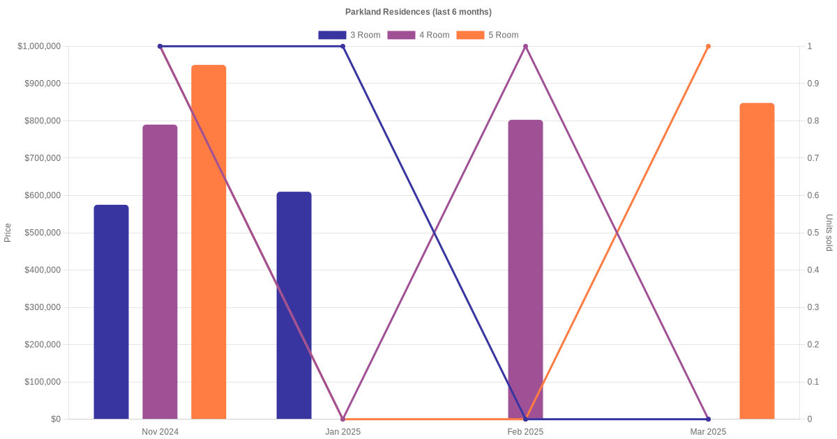 There were a total of 69 resale transactions in the last 3 years for HDB flats at Parkland Residences. The latest recorded transaction was in Nov 2025.