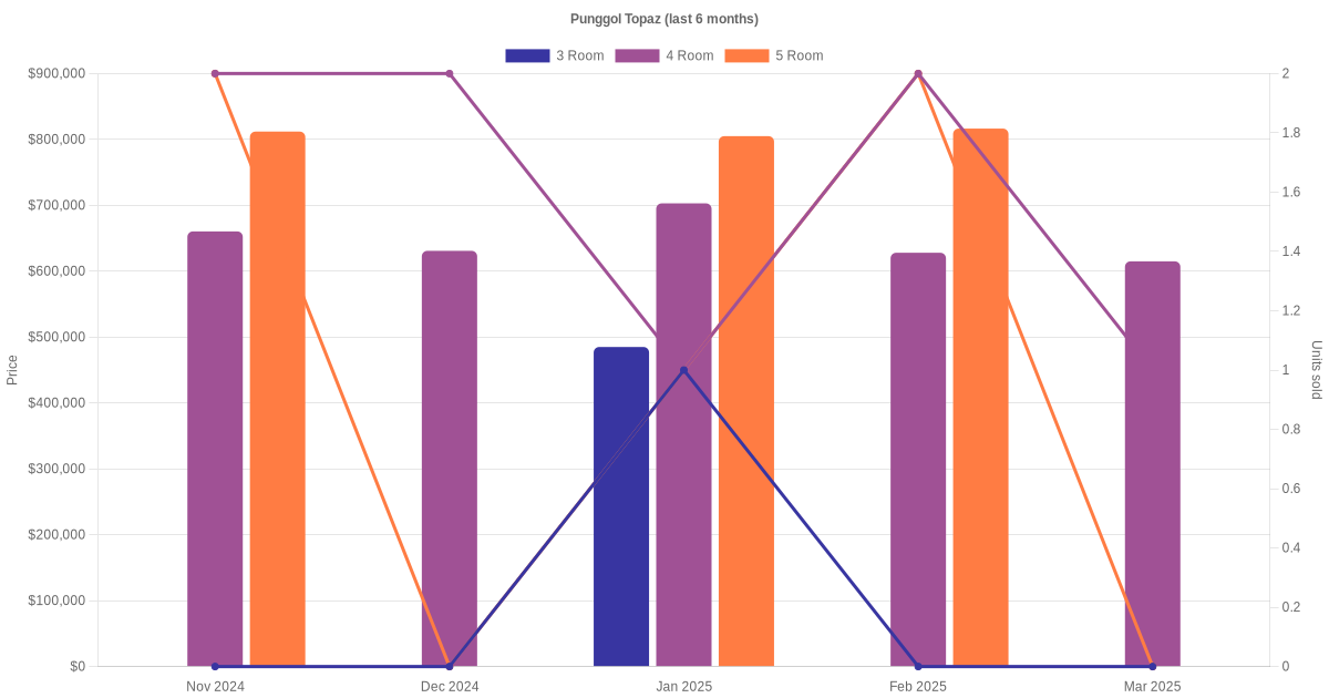 There were a total of 103 resale transactions in the last 3 years for HDB flats at Punggol Topaz. The latest recorded transaction was in Dec 2025.