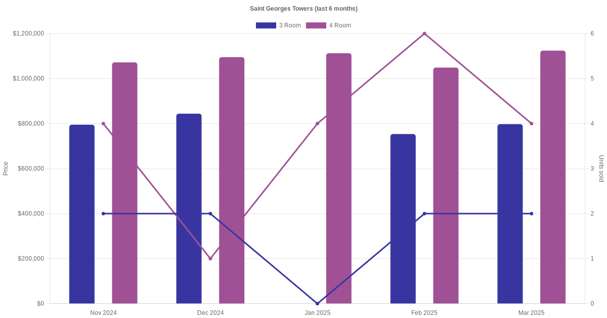 There were a total of 164 resale transactions in the last 3 years for HDB flats at Saint George's Towers. The latest recorded transaction was in Jan 2026.