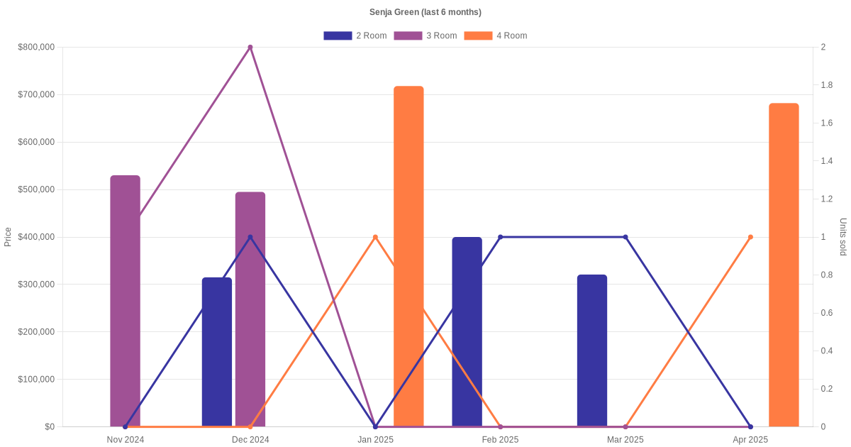 There were a total of 57 resale transactions in the last 3 years for HDB flats at Senja Green. The latest recorded transaction was in Nov 2025.