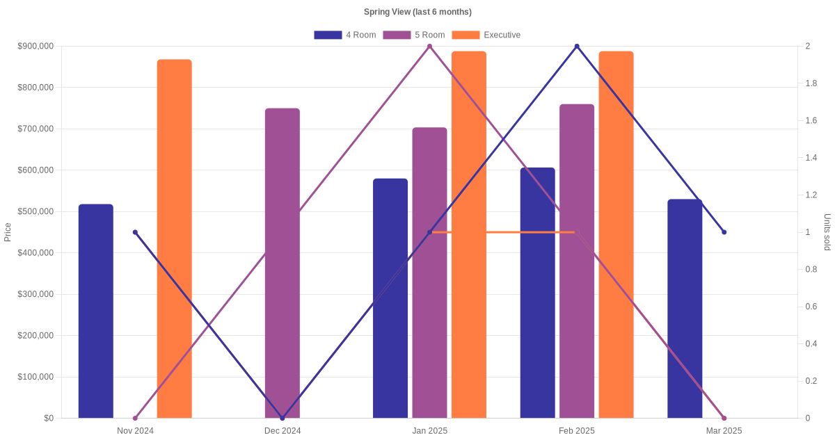 There were a total of 52 resale transactions in the last 3 years for HDB flats at Spring View. The latest recorded transaction was in Dec 2025.