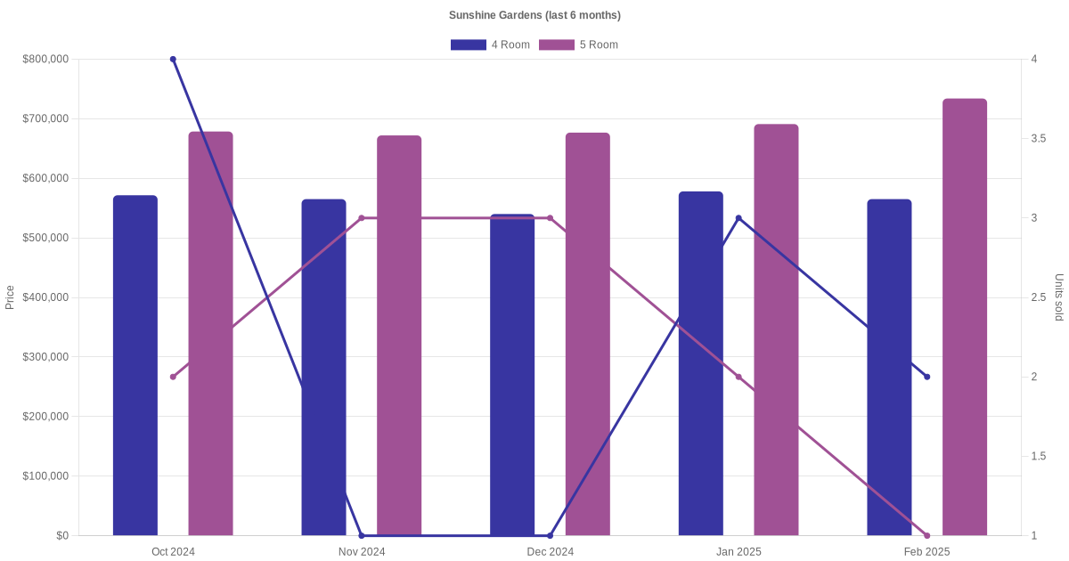 There were a total of 135 resale transactions in the last 3 years for HDB flats at Sunshine Gardens. The latest recorded transaction was in Jan 2026.