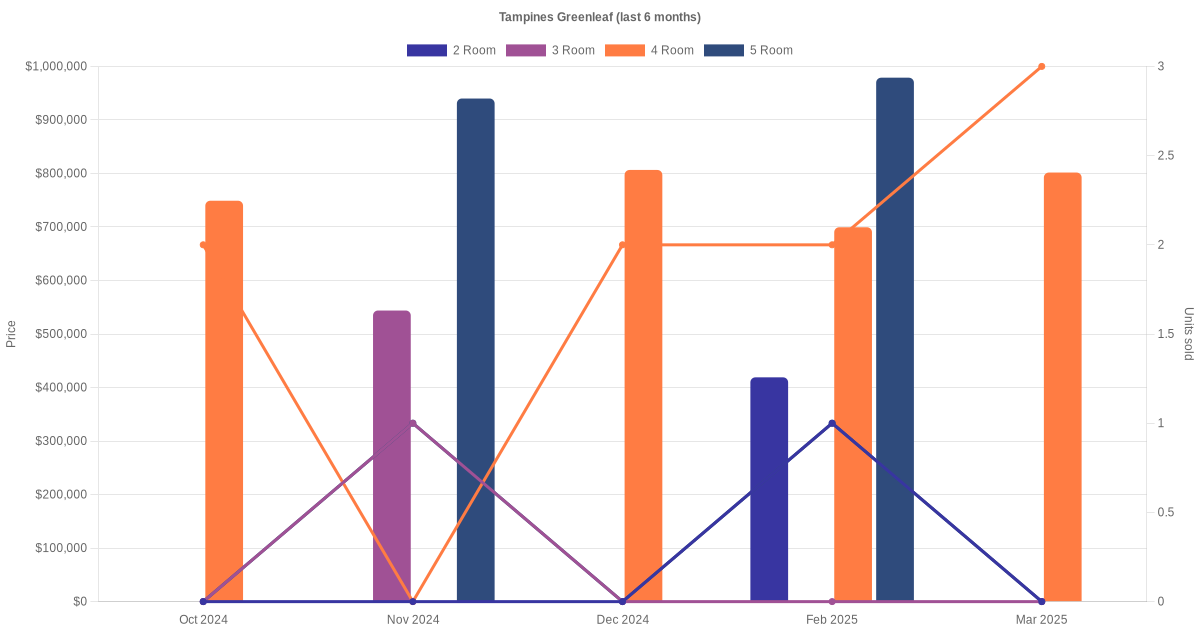 There were a total of 104 resale transactions in the last 3 years for HDB flats at Tampines Greenleaf. The latest recorded transaction was in Jan 2026.