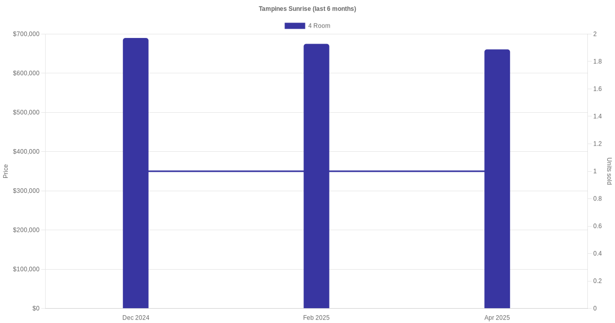 There were a total of 19 resale transactions in the last 3 years for HDB flats at Tampines Sunrise. The latest recorded transaction was in Jan 2026.