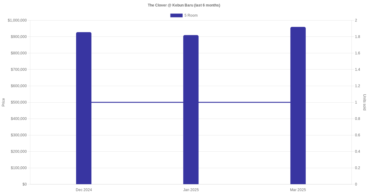 There were a total of 9 resale transactions in the last 3 years for HDB flats at The Clover @ Kebun Baru. The latest recorded transaction was in Mar 2025.