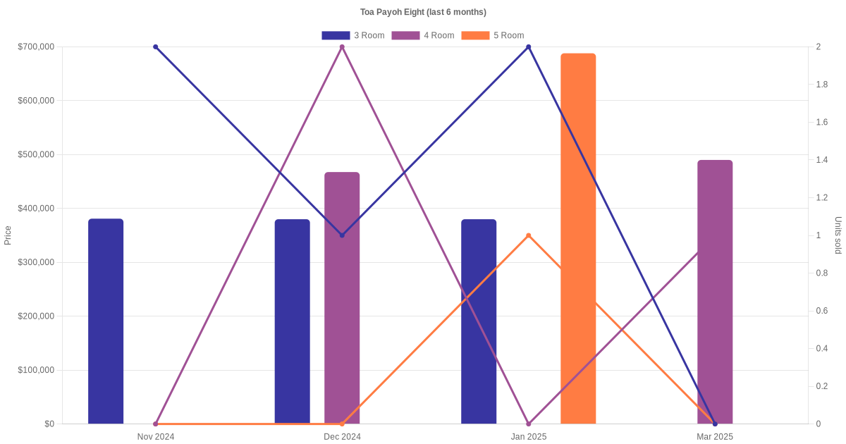 There were a total of 76 resale transactions in the last 3 years for HDB flats at Toa Payoh Eight. The latest recorded transaction was in Dec 2025.