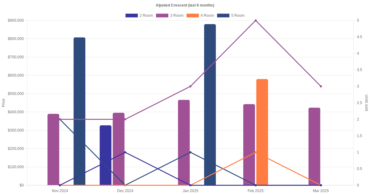 Located along Aljunied Crescent are various HDB flat types including 2 room, 3 room, 4 room and 5 room units. Shown below is a view of the resale price and transactions trends, broken down by month, in the last 3 years.