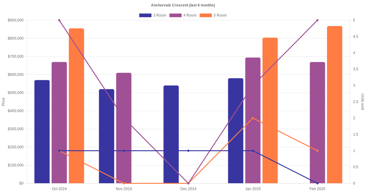 Located along Anchorvale Crescent are various HDB flat types including 3 room, 4 room and 5 room units. Shown below is a view of the resale price and transactions trends, broken down by month, in the last 3 years.