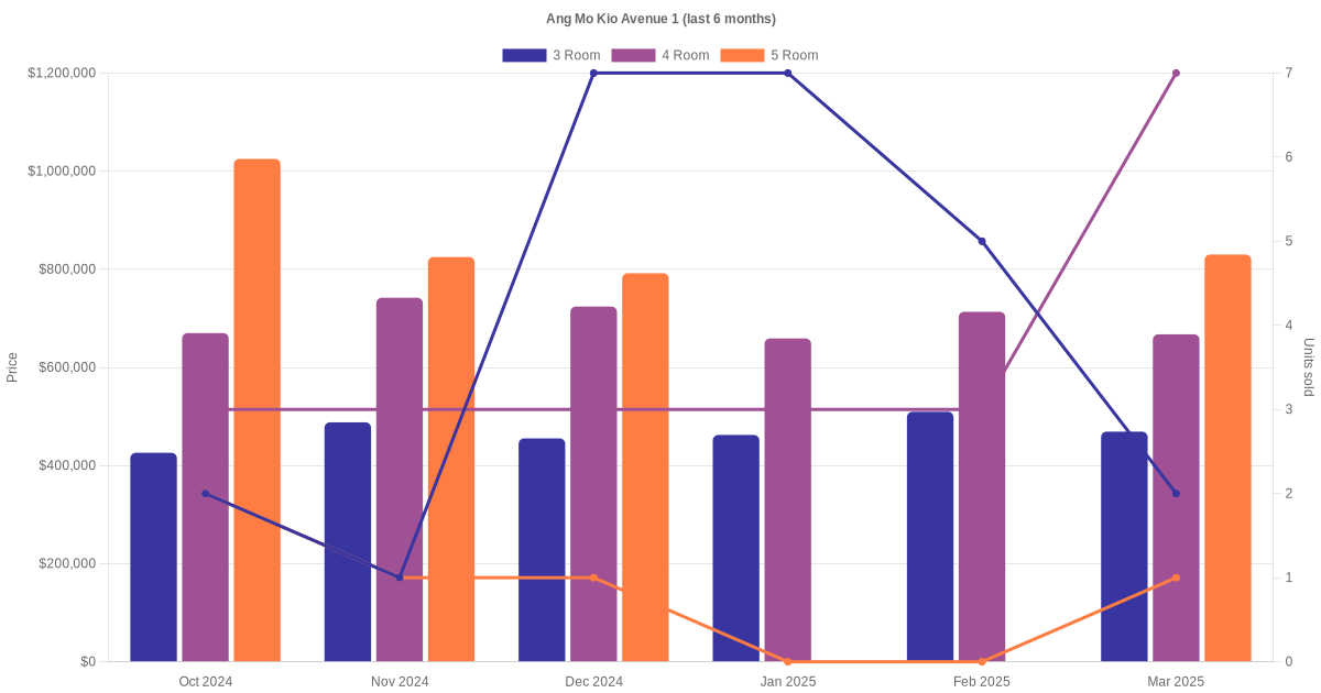 Located along Ang Mo Kio Avenue 1 are various HDB flat types including 3 room, 4 room, 5 room and executive units. Shown below is a view of the resale price and transactions trends, broken down by month, in the last 3 years.