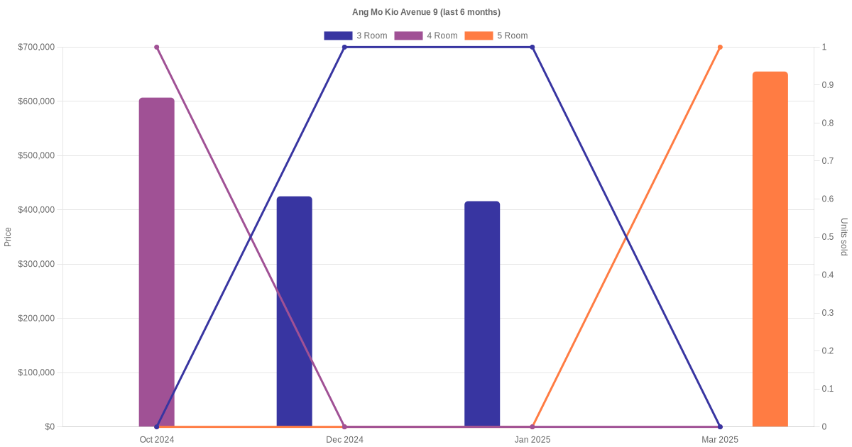 Located along Ang Mo Kio Avenue 9 are various HDB flat types including 3 room, 4 room and 5 room units. Shown below is a view of the resale price and transactions trends, broken down by month, in the last 3 years.