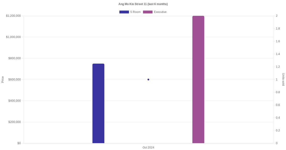 Located along Ang Mo Kio Street 11 are various HDB flat types including 5 room and executive units. Shown below is a view of the resale price and transactions trends, broken down by month, in the last 3 years.