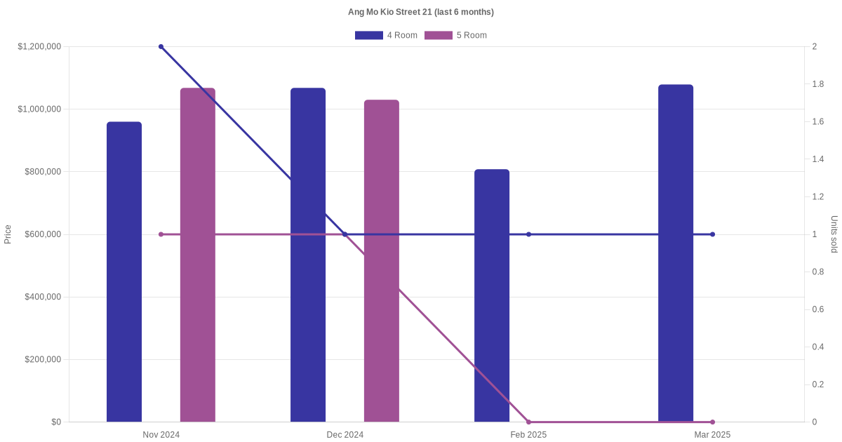 Located along Ang Mo Kio Street 21 are various HDB flat types including 4 room and 5 room units. Shown below is a view of the resale price and transactions trends, broken down by month, in the last 3 years.