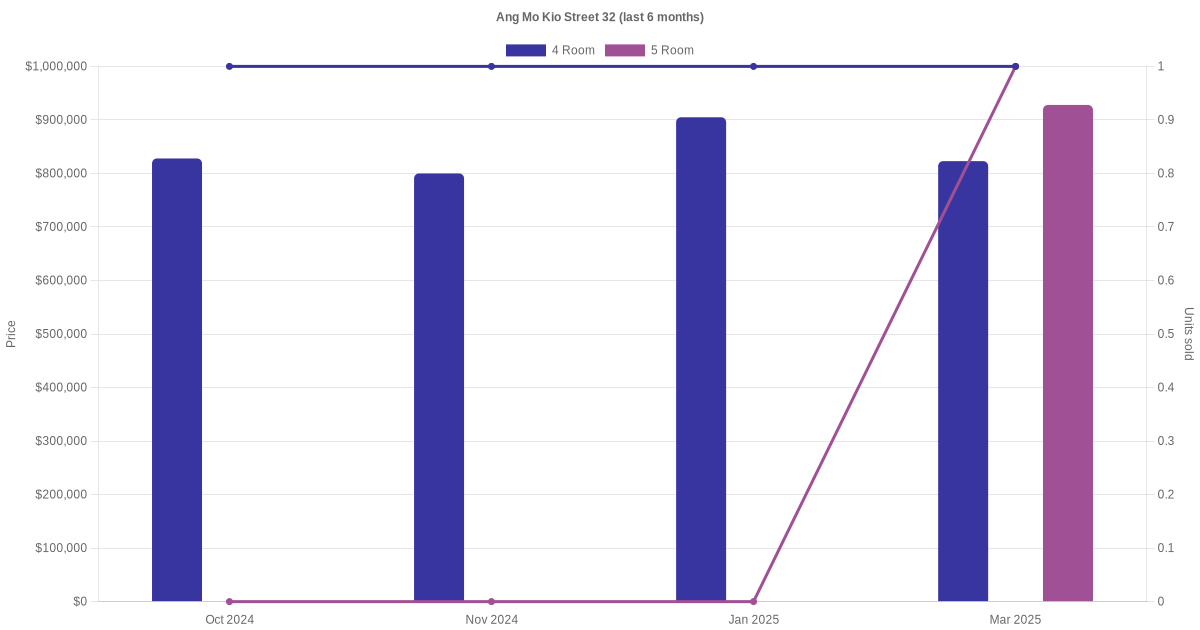 Located along Ang Mo Kio Street 32 are various HDB flat types including 4 room and 5 room units. Shown below is a view of the resale price and transactions trends, broken down by month, in the last 3 years.