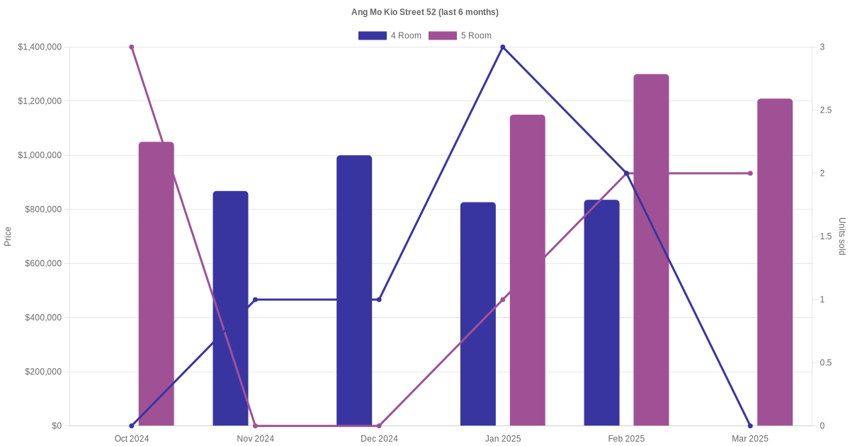 Located along Ang Mo Kio Street 52 are various HDB flat types including 4 room and 5 room units. Shown below is a view of the resale price and transactions trends, broken down by month, in the last 3 years.
