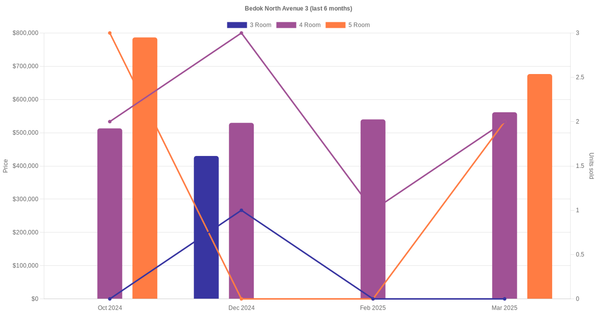 Located along Bedok North Avenue 3 are various HDB flat types including 3 room, 4 room and 5 room units. Shown below is a view of the resale price and transactions trends, broken down by month, in the last 3 years.