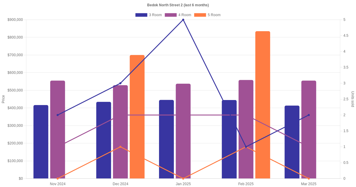Located along Bedok North Street 2 are various HDB flat types including 2 room, 3 room, 4 room, 5 room and executive units. Shown below is a view of the resale price and transactions trends, broken down by month, in the last 3 years.