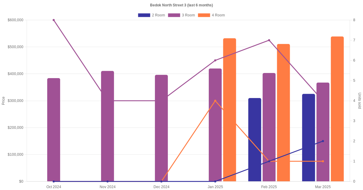 Located along Bedok North Street 3 are various HDB flat types including 2 room, 3 room, 4 room, 5 room and executive units. Shown below is a view of the resale price and transactions trends, broken down by month, in the last 3 years.