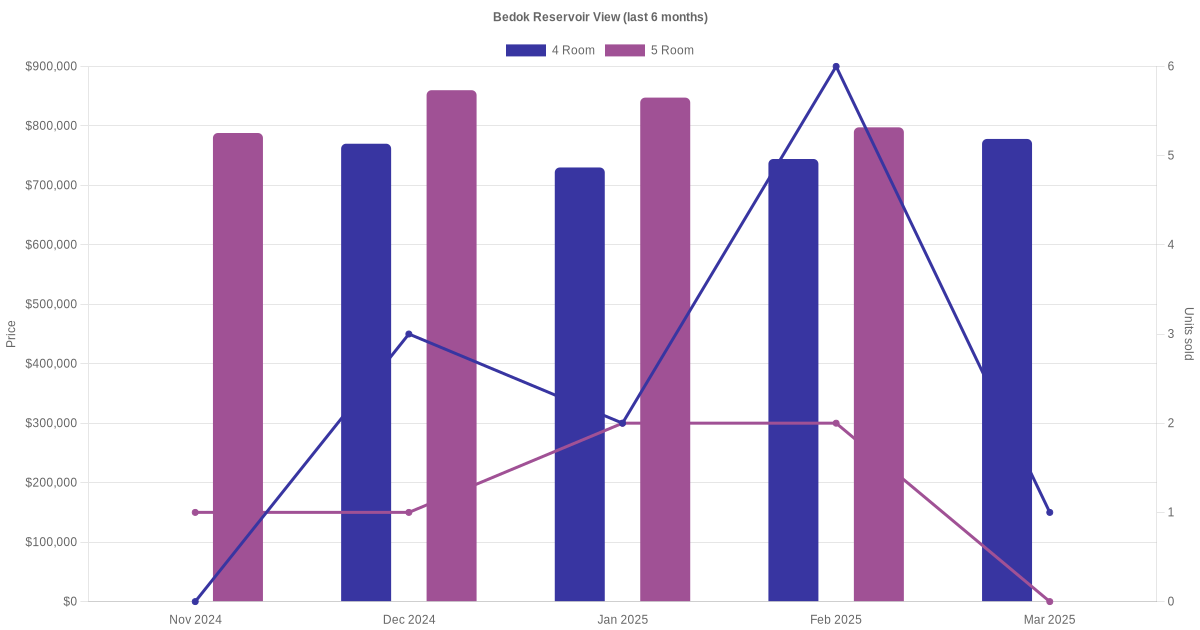 Located along Bedok Reservoir View are various HDB flat types including 4 room and 5 room units. Shown below is a view of the resale price and transactions trends, broken down by month, in the last 3 years.
