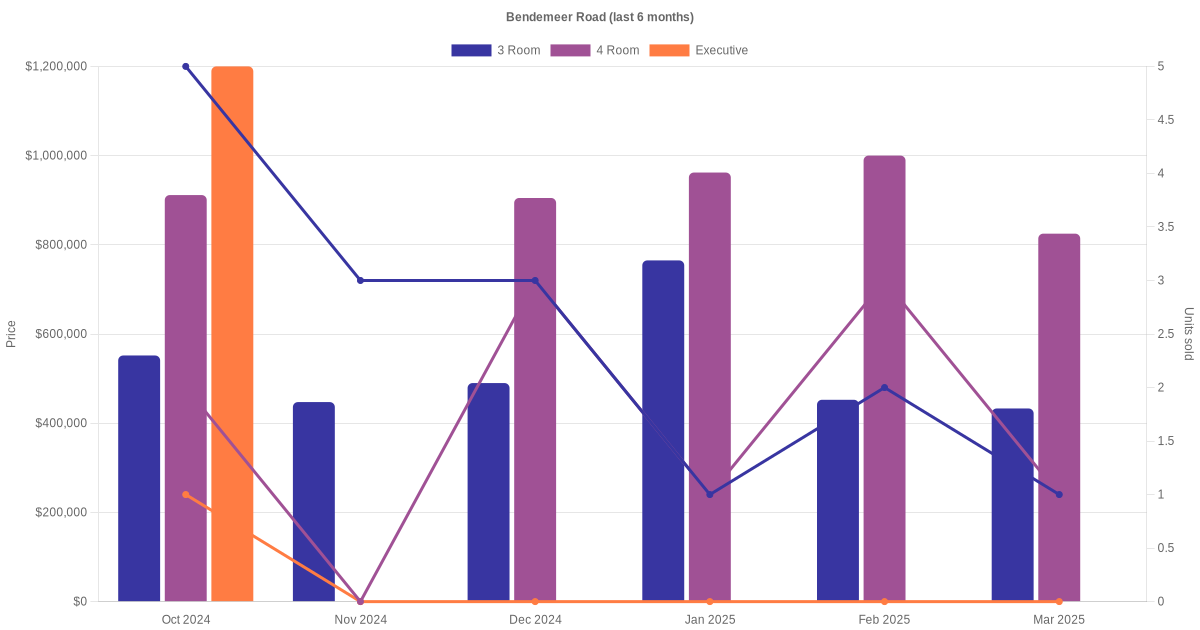 Located along Bendemeer Road are various HDB flat types including 3 room, 4 room, 5 room and executive units. Shown below is a view of the resale price and transactions trends, broken down by month, in the last 3 years.