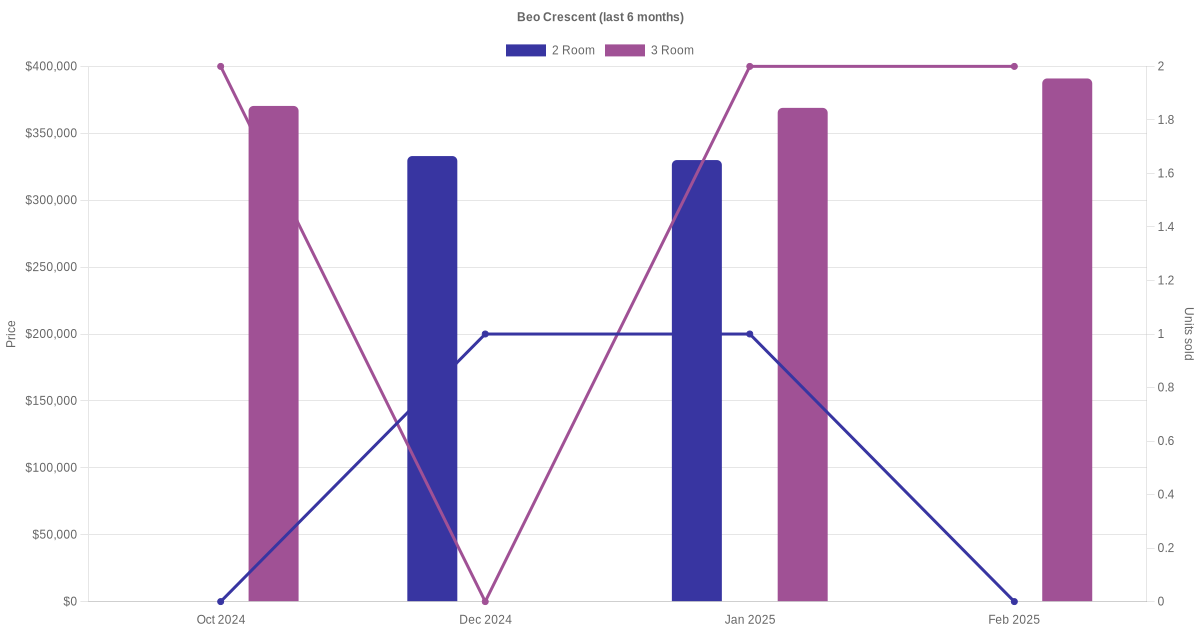 Located along Beo Crescent are various HDB flat types including 2 room and 3 room units. Shown below is a view of the resale price and transactions trends, broken down by month, in the last 3 years.
