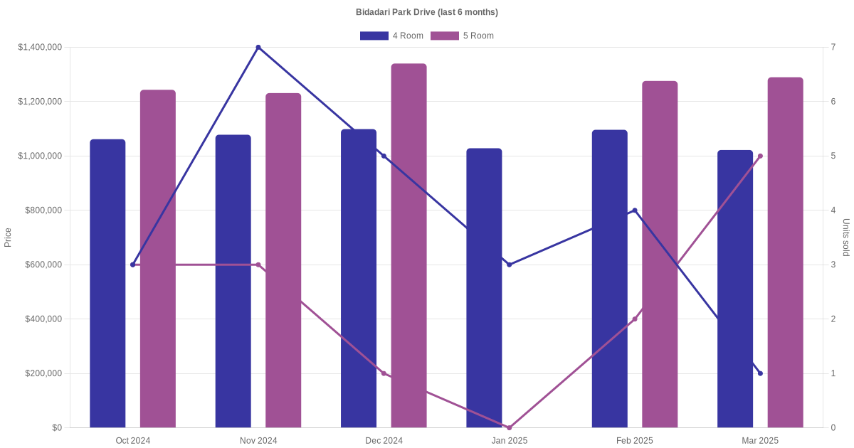 Located along Bidadari Park Drive are various HDB flat types including 3 room, 4 room and 5 room units. Shown below is a view of the resale price and transactions trends, broken down by month, in the last 3 years.