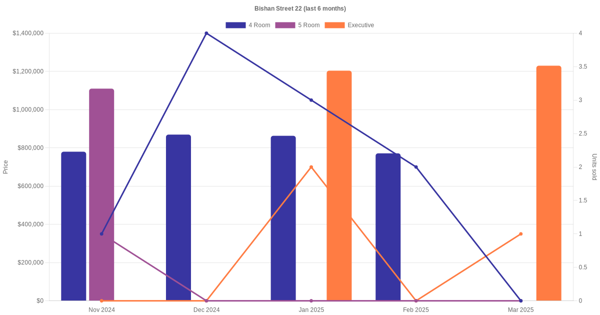Located along Bishan Street 22 are various HDB flat types including 4 room, 5 room and executive units. Shown below is a view of the resale price and transactions trends, broken down by month, in the last 3 years.