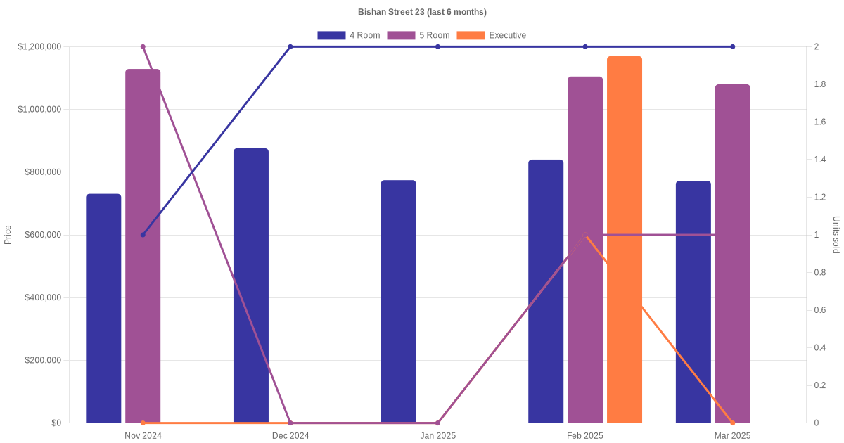 Located along Bishan Street 23 are various HDB flat types including 4 room, 5 room and executive units. Shown below is a view of the resale price and transactions trends, broken down by month, in the last 3 years.