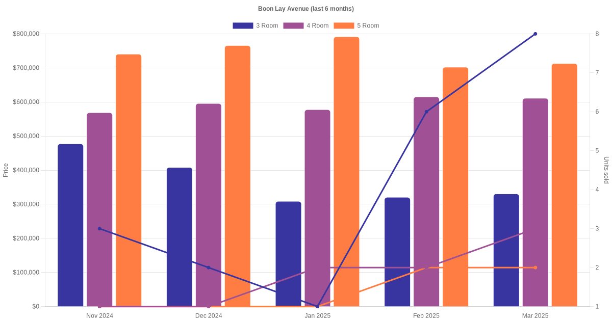 Located along Boon Lay Avenue are various HDB flat types including 3 room, 4 room and 5 room units. Shown below is a view of the resale price and transactions trends, broken down by month, in the last 3 years.