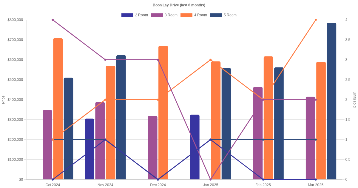 Located along Boon Lay Drive are various HDB flat types including 2 room, 3 room, 4 room and 5 room units. Shown below is a view of the resale price and transactions trends, broken down by month, in the last 3 years.