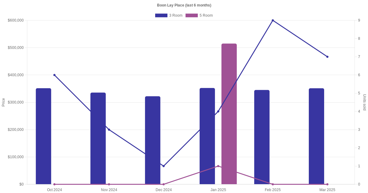 Located along Boon Lay Place are various HDB flat types including 3 room and 5 room units. Shown below is a view of the resale price and transactions trends, broken down by month, in the last 3 years.