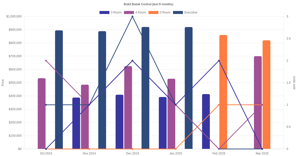 Located along Bukit Batok Central are various HDB flat types including 3 room, 4 room, 5 room and executive units. Shown below is a view of the resale price and transactions trends, broken down by month, in the last 3 years.