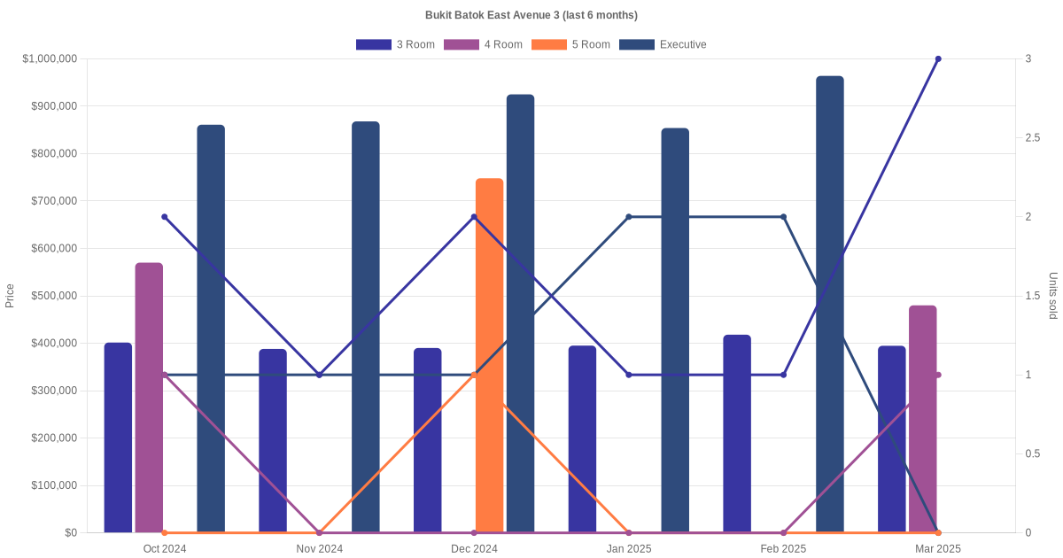 Located along Bukit Batok East Avenue 3 are various HDB flat types including 3 room, 4 room, 5 room and executive units. Shown below is a view of the resale price and transactions trends, broken down by month, in the last 3 years.