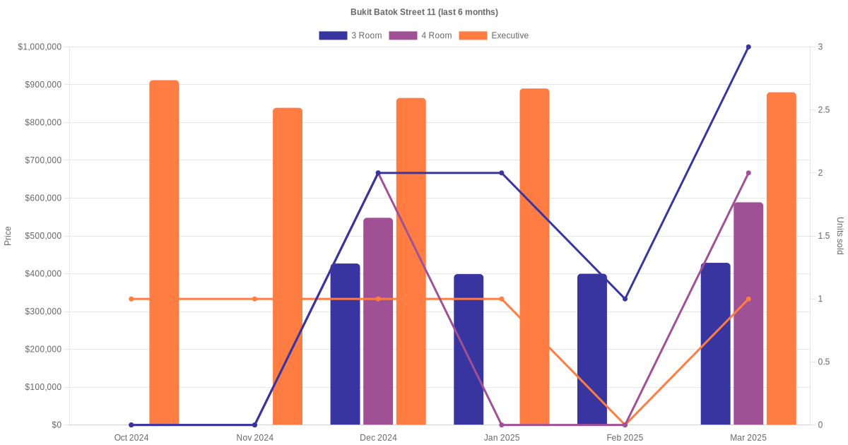 Located along Bukit Batok Street 11 are various HDB flat types including 3 room, 4 room and executive units. Shown below is a view of the resale price and transactions trends, broken down by month, in the last 3 years.