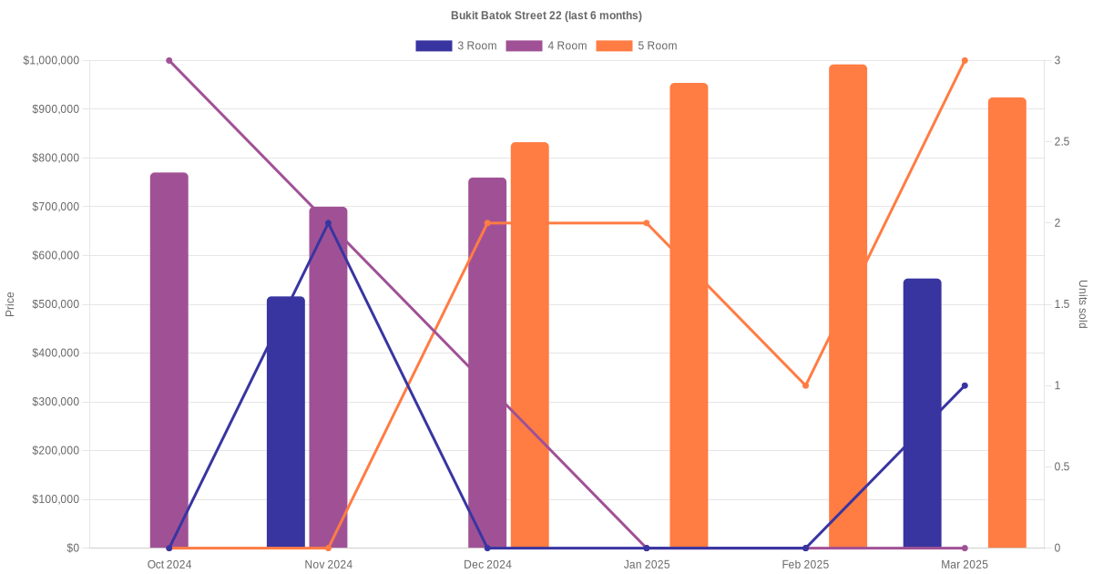 Located along Bukit Batok Street 22 are various HDB flat types including 3 room, 4 room and 5 room units. Shown below is a view of the resale price and transactions trends, broken down by month, in the last 3 years.