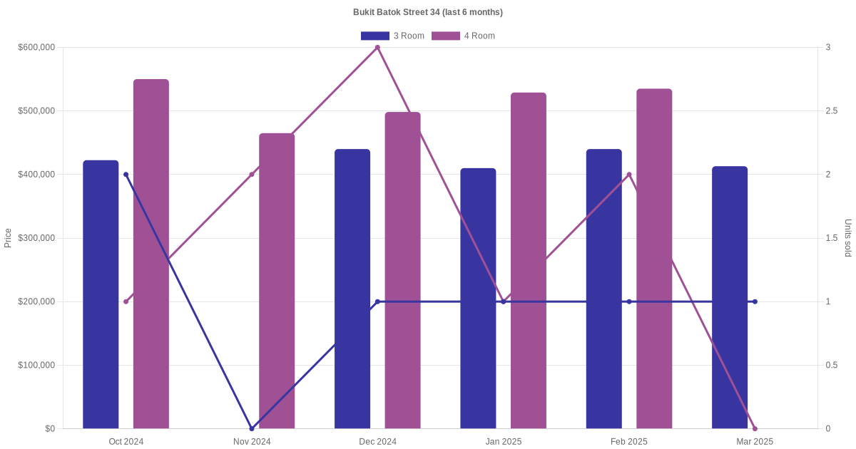 Located along Bukit Batok Street 34 are various HDB flat types including 3 room, 4 room, 5 room and executive units. Shown below is a view of the resale price and transactions trends, broken down by month, in the last 3 years.