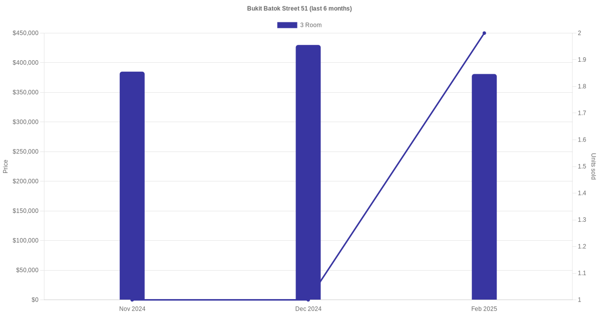 Located along Bukit Batok Street 51 are various HDB flat types including 3 room, 4 room, 5 room and executive units. Shown below is a view of the resale price and transactions trends, broken down by month, in the last 3 years.