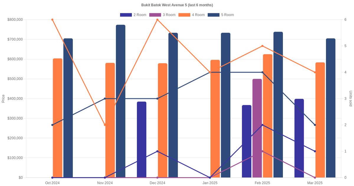 Located along Bukit Batok West Avenue 5 are various HDB flat types including 2 room, 3 room, 4 room and 5 room units. Shown below is a view of the resale price and transactions trends, broken down by month, in the last 3 years.