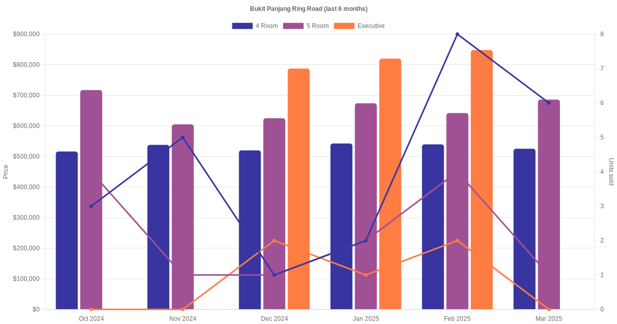 Located along Bukit Panjang Ring Road are various HDB flat types including 4 room, 5 room and executive units. Shown below is a view of the resale price and transactions trends, broken down by month, in the last 3 years.