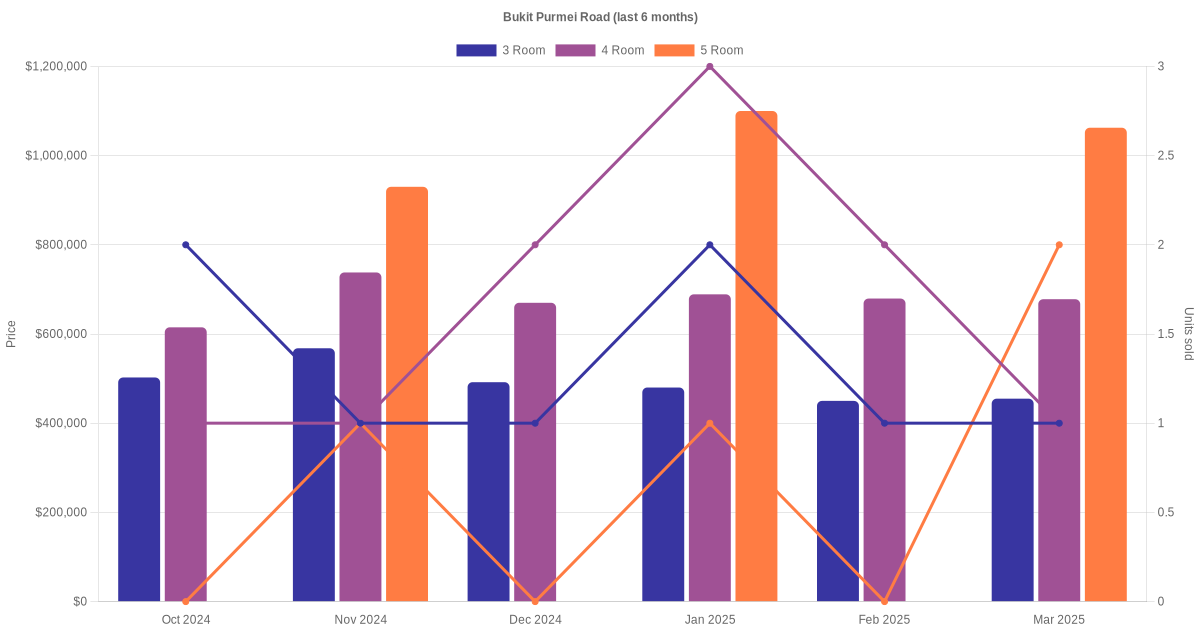 Located along Bukit Purmei Road are various HDB flat types including 3 room, 4 room and 5 room units. Shown below is a view of the resale price and transactions trends, broken down by month, in the last 3 years.