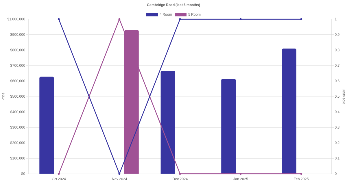 Located along Cambridge Road are various HDB flat types including 4 room and 5 room units. Shown below is a view of the resale price and transactions trends, broken down by month, in the last 3 years.