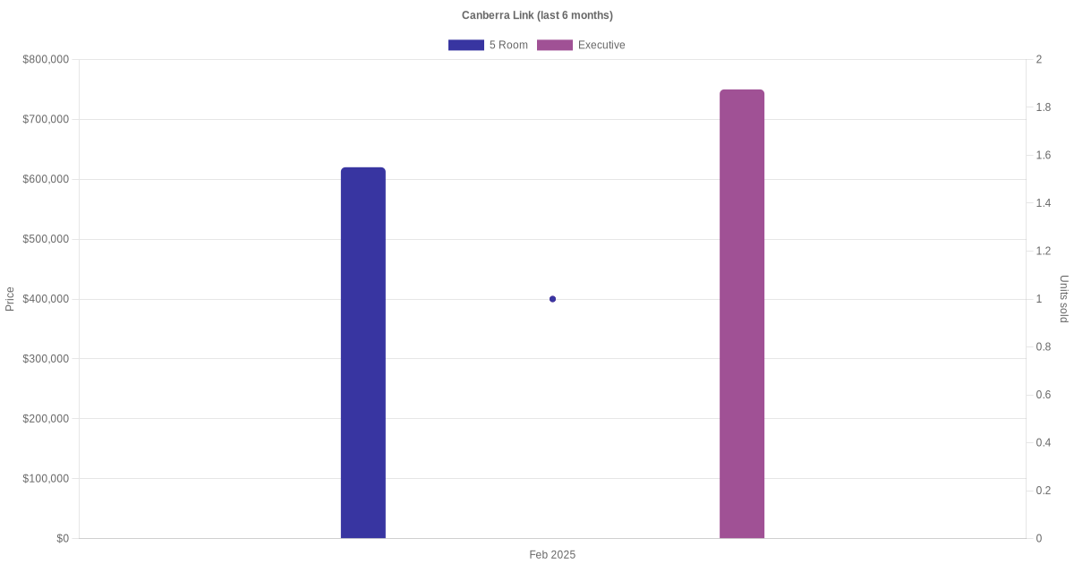 Located along Canberra Link are various HDB flat types including 4 room, 5 room and executive units. Shown below is a view of the resale price and transactions trends, broken down by month, in the last 3 years.