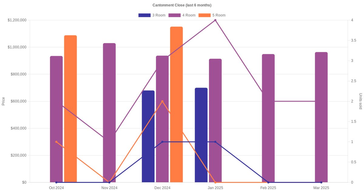 Located along Cantonment Close are various HDB flat types including 3 room, 4 room and 5 room units. Shown below is a view of the resale price and transactions trends, broken down by month, in the last 3 years.